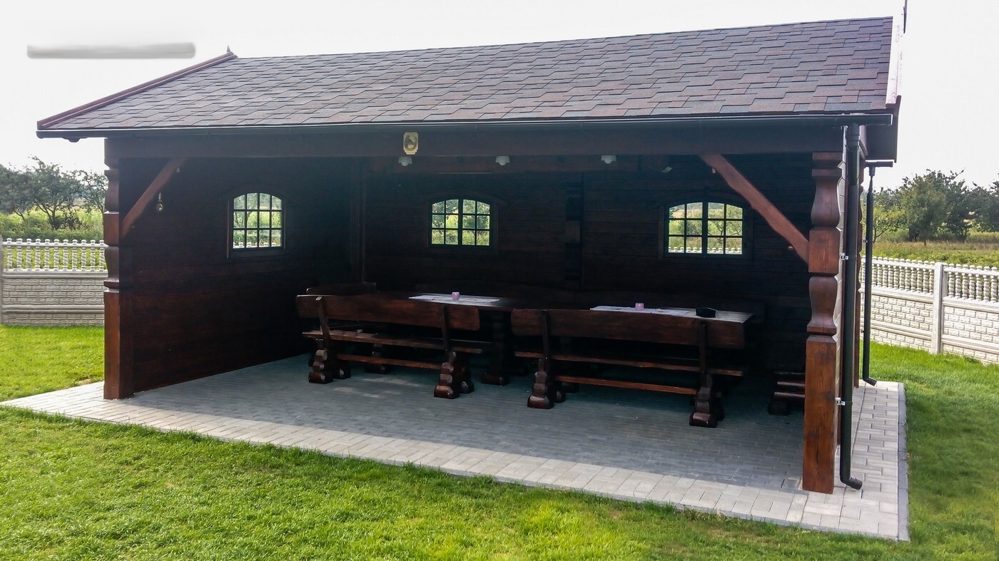 Materiał: Konstrukcja altany (słupy pionowe i wieniec) z suchego drewna klejonego warstwowo – świerk